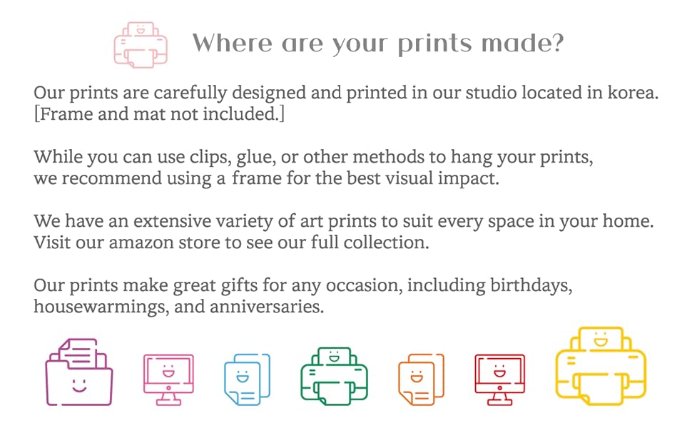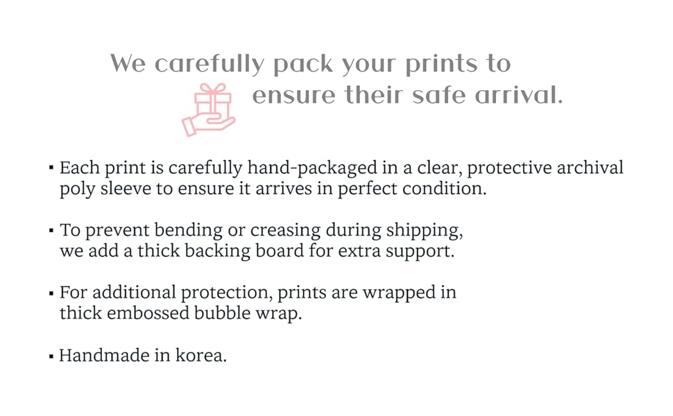 • FROM MY HOME TO YOURS: I print, inspect, and package all my art in my home studio in Korea. Nothing is mass-produced.