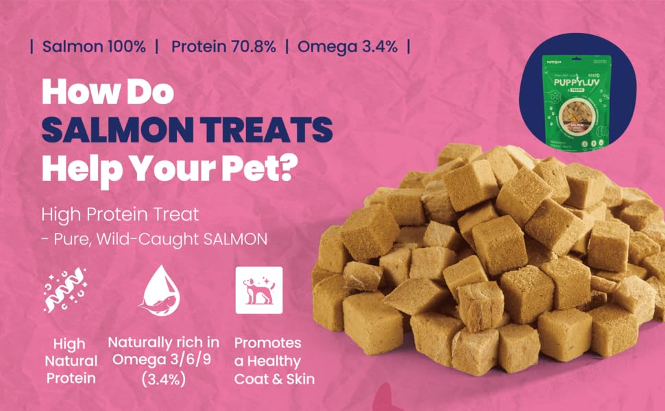• Pure 100% SINGLE INGREDIENT FREEZE DRIED SALMON TREATS: PuppyLuv Freeze-Dried Treats are made with 100% natural ingredients, delivering the pure power of nature with no additives, fillers, or preservatives. Packed with over 70% high-quality protein, verified through FDA ingredient analysis, these treats provide essential amino acids that support muscle growth, energy, and overall health for both dogs and cats. Sourced from nature’s best, our premium salmon treats are highly digestible and ideal for pets with allergies or on specialized diets.