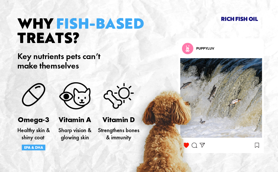 • PROMOTES A HEALTHY COAT & SKIN WITH PURE FISH OIL: Our treats are made with grain-free, wild-caught fish oil, a rich source of Omega-3 fatty acids (EPA & DHA) that help nourish the skin, reduce inflammation, and enhance coat shine and softness. Because they are free from grains and unnecessary additives, they provide a gentle, natural source of essential fatty acids, making them an excellent choice for dogs and cats with sensitive diets—supporting hydrated, itch-free skin and a lustrous, healthy coat with every bite.