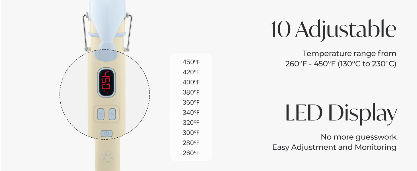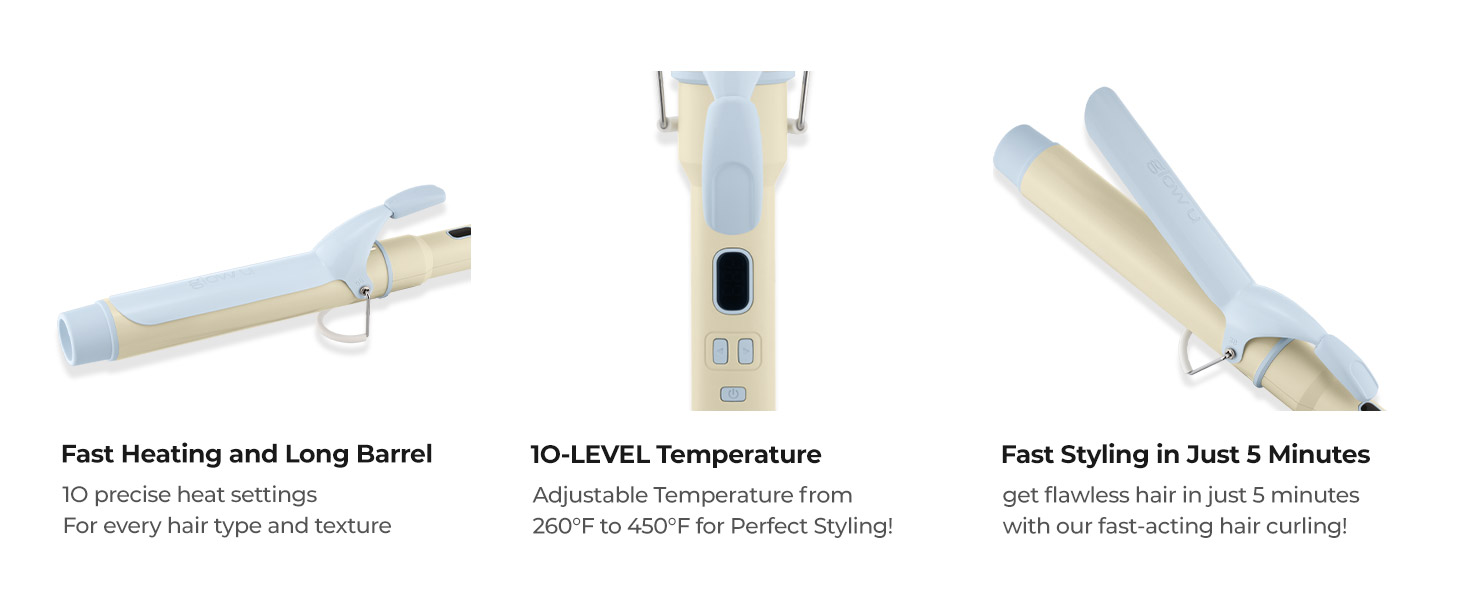 - Versatile and Protective – Choose from 10 adjustable heat levels(260°F to 450°F) for precise control, making this curling iron suitable for all hair types. The ceramic coated barrel ensures smooth, healthy curls with minimal heat damage.