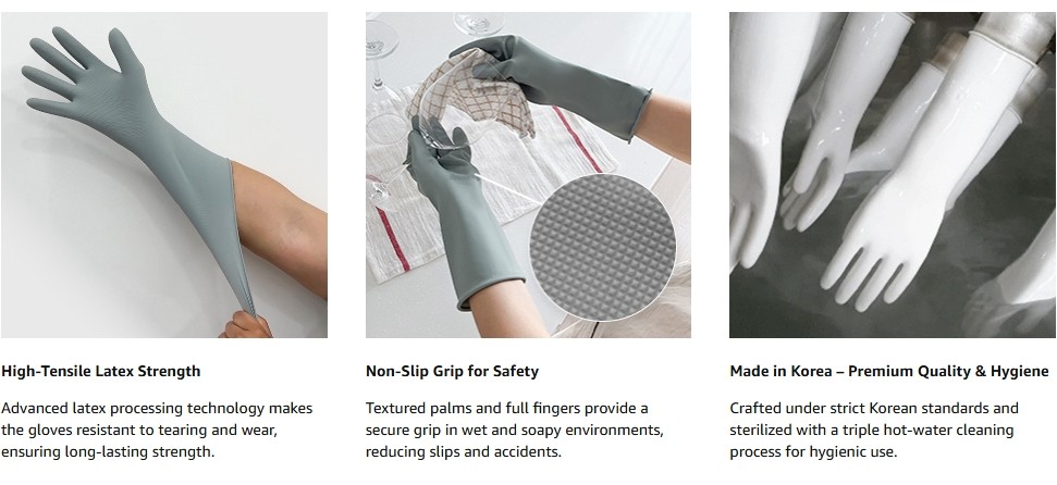 • kitchen gloves reusable latex dishwashing glove sweat-free cleaning gloves non-slip rubber gloves waterproof household rubber gloves durable glove easy to remove glove natural latex inner lining non sticky glove heat resistant made in korea
